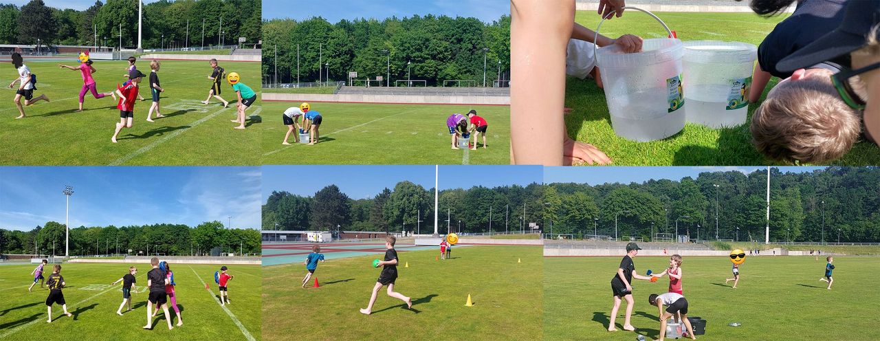 An heißen Tagen wurde sogar Wasserspiele bevorzugt, damit das Training nicht ausfällt. Statt Bälle gab es Handtücher, die zu einem Ball „geformt“ wurden, oder Becher, die mit Wasser gefüllt waren. Anstatt zu werfen wurden bei zwei Mannschaften zu zweit ein Handtuch ins Wasser getränkt, danach mitsamt durchnässtem Handtuch zu einem Eimer in einer Entfernung gerannt, um das Wasser aus dem Handtuch zu „drehen“ und den nächsten Mitspielern das noch feuchte Handtuch zu übergeben. Am Ende wurde geprüft, welche Mannschaft das meiste Wasser im 2. Eimer hatte. Mit Wasser gefüllten Becher musste Hindernisse, wie über eine Hürde springen, oder um eine Stange drehen und unter einem Hindernis hindurch gelaufen werden, bevor das Wasser im nächsten Eimer landet. Am Ende des Trainings durften sie sich dann gegenseitig nass machen. :) Also, bei heißem Wetter gibt es immer Spiele, wo man improvisieren kann! Spiele ohne Ball waren die Staffelspiele, wo 2 Mannschaften in einem Viereck gegenüber stehend gleichzeitig loslaufen und mit ihrer schnellen Geschwindigkeit verhindern mussten, dass der Gegner keine Runde überholt. Anhand ihrer wöchentlich lachenden Gesichter während der Bewegungszeit konnte man erkennen, dass sie alle mächtig viel Spaß hatten!