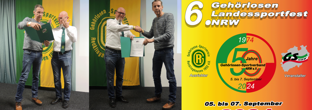 Ralf Geerk, Vizepräsident Breitensport des GSNRW, überreichte am 17.12.2022 im Rahmen der Weihnachtsfeier des GSV Recklinghausen die Ehrenurkunde zum 70 jährigen Bestehen des Vereins im Gehörlosen-Zentrum in Recklinghausen. In einer Power Point Präsentation zeigte Ralf Geerk eine Präsentation über die 70-jährige Geschichte des GSV Reckinghausen und auch ein Plakat mit dem Logo vom Landessportfest 2024 in Recklinghausen, dazu überreichte er noch ein Präsent für den Verein.